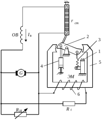 . Электромагнитная система регулятора имеет сердечник 5 с обмоткой 6 и якорь 2. На якорь электромагнита действуют три основные силы: усилие электромагнита, направленное ему навстречу усилие пружины 3 и сила упругой деформации угольного столба. Якорь находится в равновесии, если сумма моментов, создаваемых этими силами, равна нулю.
