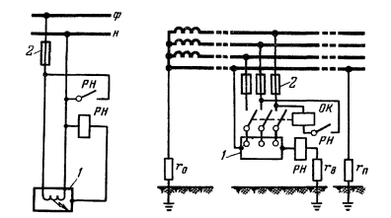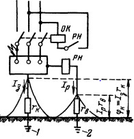 - ток, стекающий в землю; РН - реле максимального напряжения; ОК - отключающая катушка автоматического выключателя.