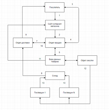 Стрелкой под номером 12 обозначено взаимодействие отдела закупок и поставщиков.