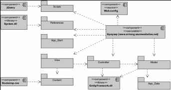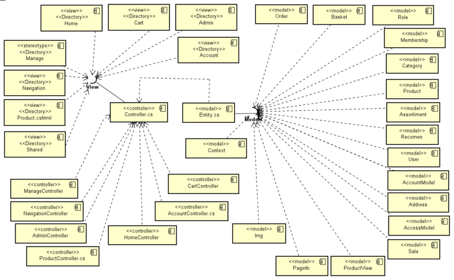 На рисунке 2.14 показаны отношения зависимости между компонентами и их классами. Согласно шаблону MVC, разрабатываемая системы разделяется на модели, представления и контроллеры, их структура и взаимосвязь отображены на диаграмме компонентов, приведённой ниже.