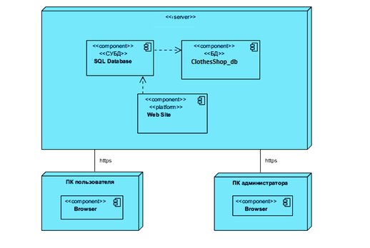 Из диаграммы, представленной на рисунке 2.15 видно, что Пользователь и Администратор получают доступ к интернет магазину через браузер, переходя на соответсвующий URL-адрес. Само приложениебудет размещено на хостинг сервере.