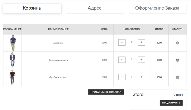Оформление заказа начинается со страницы корзины, которая приведена на рисунке 4.7. На этой странице расположена таблица с товарами пользователя и итоговая стоимость всех товаров. В таблице отображается изображение товара, его наименование, цена за единицу товара, количество товаров и итоговая стоимость по наименованию. Изменение количества товаров происходит по нажатию пиктограмм “плюс” и “минус” в соответствующей строке таблицы. Для удаления всех позиций наименования нужно нажать на пиктограмму урны.