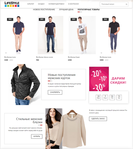 Главная страница должна сразу показывать назначение сайта, поэтому сразу под панелью навигации расположен интерактивный слайдер. После него следует интерактивный блок в который выводятся товары, которые разделены по следующим параметрам: