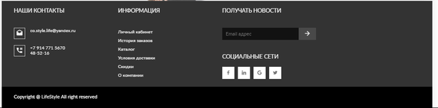 В нижней части страницы расположена область, которая называется подвалом. Она также является общей для каждой страницы интернет-магазина. На рисунке 4.3 приведён внешний вид подвала. Он состоит из трёх блоков: котнтактная информация для обратной связи с оператором интернет-магазина; ссылки на основные разделы сайта; строка для подписки на рассылку новостей от сайта и ссылки на социальные сети.