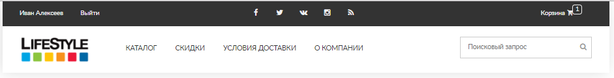 Знакомство с сайтом начинается с его главной страницы, которая включает в себя панель навигации, общую для всех страниц интернет магазина. Её вид, для авторизованного пользователя приведён на рис 4.1. Для неавторизованного пользователя вместо имени, фамилии пользователя и кнопки выйти расположены кнопки для перехода к авторизации и регистрации.
