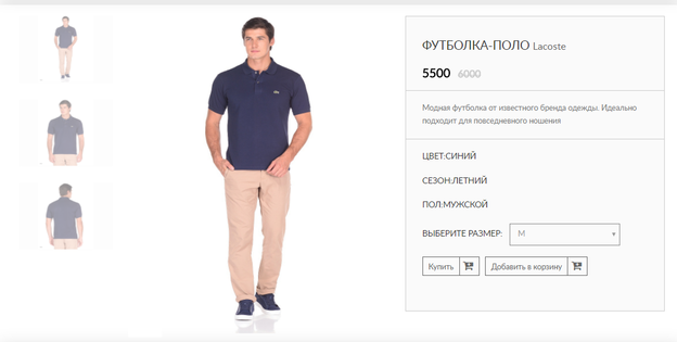 Доступ к подробной информации о товаре осуществляется посредством клика по наименованию товара или его изображению. На рисунке 4.6 представлен внешний страницы просмотра подробной информации о товаре. В левой части экрана расположены минималистичные изображения товара, по центру его презентационный формат. В правой содержатся характеристики товара: его наименование, бренд, цена, цвет, сезон и так далее. Перечёркнутой выводится старая цена товара, для наглядности скидки.