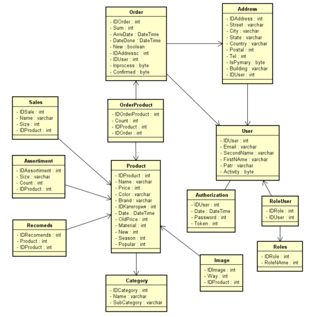 Для наглядного отображения структуры базы данных на рисунке 3.1 приведена логическая схема данных, в которой показана структура и связи между таблицами. Напраленная ассоциация в данном случае означает наличие ссылки в объекте из кторого выходит стрелка, другими словами в этой таблице содержиться идентификатор родительской таблицы, при помощи которого создаётся связь многие к одному.