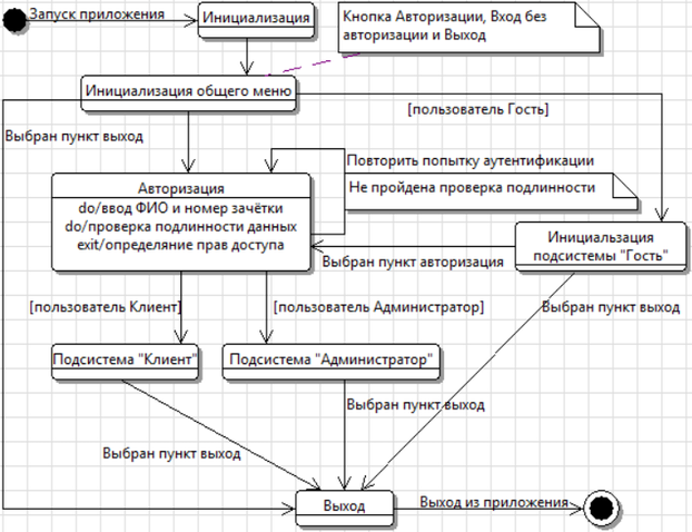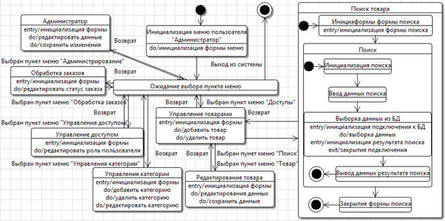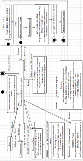 Рассмотрим рисунок 2.3 на нём отображена контекстная диаграмма автоматов, моделирующая реакцию системы на выбор пользователем пунктов меню и переходы между ними.