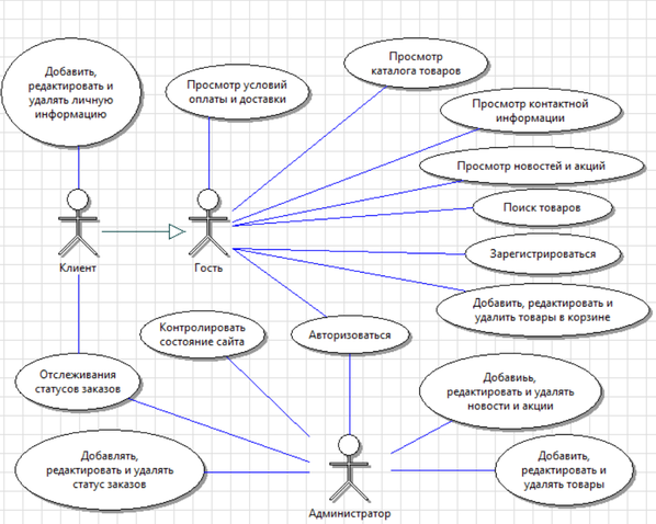 гость – потенциальный клиент который заходит на сайт с целью просмотра и заказа товара.
