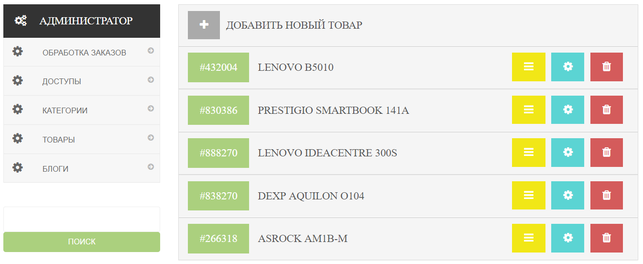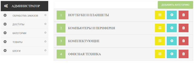 Главная задача администратора – это обеспечить интернет-магазин актуальным контентом. Для этого в личном кабинете администратора есть меню, через которое он может выбрать раздел, в котором будет работать.