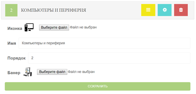 На рисунке 4.15 показана форма редактирования категорию. При на нажатие на синюю кнопку в виде шестерёнки, открывается форма редактирования категории. В этой форме можно указать иконку категории, которая будет отображаться на главном меню категорий, а также можно указать название и последовательность отображения категории в главном меню.