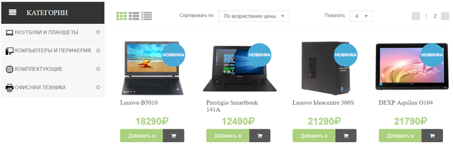 На Рисунке 4.7 представлен один из способов выбора товара, который представляет собой каталог товаров. В этом каталоге можно поменять вид, количество и сортировку отображения товара на странице.