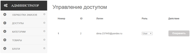 На рисунке 4.15 показана раздел управления доступом. В этом разделе администратор управляет ролью пользователя в системе меня его с клиента на администратора или наоборот.