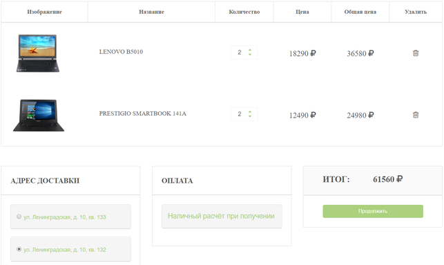 На Рисунке 4.8 представлена корзина клиента. В ней представлены товары, выбранные клиентом. Клиент может выбрать количество товара, которое он хочет купить, а также может удалить товар из корзины.