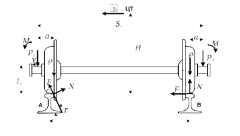 Р1-ш и Р2-ш – нагрузка от кузова на шейки оси колесной пары; Р1-р и Р2-р - нагрузка от колес на рельсы; М1 и М2 – моменты, действующие не шейки оси; а1 и а2 – расчетные консоли шеек оси; Yр – рамная сила; lр – расстояние от головки рельса до приложенной рамной силы; Jн – центробежная сила; Нц – расстояние от головки рельса до места приложения центробежной силы; F1 и F2 – силы трения гребня и поверхности катания колес по рельсам; N1 и N2 – реакции рельсов; S1 – расстояние между точками контакта колес с рельсами; Sш - расстояние между точками приложения сил к шейкам оси.