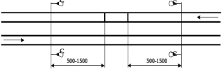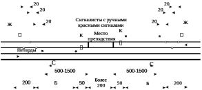 Места производства работ, требующие остановки поездов, при фронте работ более 200 м, ограждаем сигналами остановки порядком, указанным на рисунке 3.3.