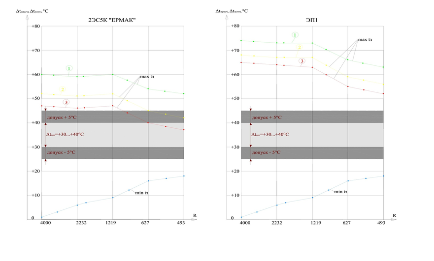 Рисунок 1 – Расчетные и оптимальные температуры закрепления при проходе электровозов 2ЭС5К «ЕРМАК» и ЭП1