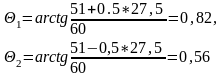 Углы Θ1 и Θ2 , радиан, определяются по формулам: