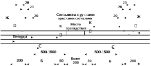 Места производства работ, требующие остановки поездов, при фронте работ более 200 м, ограждаем сигналами остановки порядком, указанным на рисунке 3.3.
