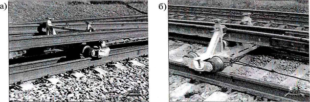а) тележка для перемещения рельсовых плетей из середины колеи на подрельсовые площадки; б) тележка для перемещения инвентарных рельсов с посадочных мест внутрь колеи.
