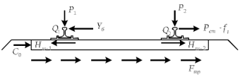 Р1 и Р2 – нагрузка от колеса на рельсы; Yб – боковая сила на упорный рельс; Q1 и Q2 – давление рельсов на шпалу; Нш-1 и Нш-z – поперечные силы, действующие на шпалу от двух рельсов; С0 – начальное сопротивление смещению шпалы; Fтр – сила трения шпалы по балласту; fр – коэффициент трения скольжения колеса по рельсу.