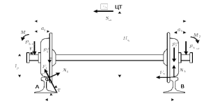 Р1-ш и Р2-ш – нагрузка от кузова на шейки оси колесной пары; Р1-р – полная динамическая вертикальная нагрузка передаваемая от левого колеса на рельс A в точке O; Р2-р- правая динамическая вертикальная нагрузка, передаваемая от правого колеса на рельс B по кругу катания колеса; М1 и М2 – моменты, действующие на шейки оси; а1и а2 – расчетные консоли шеек оси; Yр – рамная сила; lр – расстояние от головки рельса до приложенной рамной силы; Jн – центробежная сила; Нц – расстояние от головки рельса до места приложения центробежной силы; F1 и F2 – силы трения гребня и поверхности катания колес по рельсам; N1 и N2 – реакции рельсов; S1 – расстояние между точками контакта колес с рельсами; Sш - расстояние между точками приложения сил к шейкам оси.