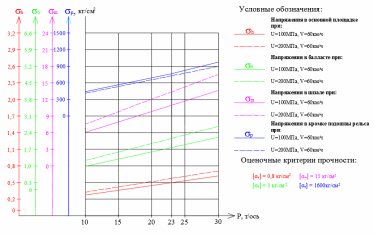 Напряжения в остальных элементах растут по зависимости близкой к параболе. Напряжения во всех элементах верхнего строения пути меньше допускаемых.