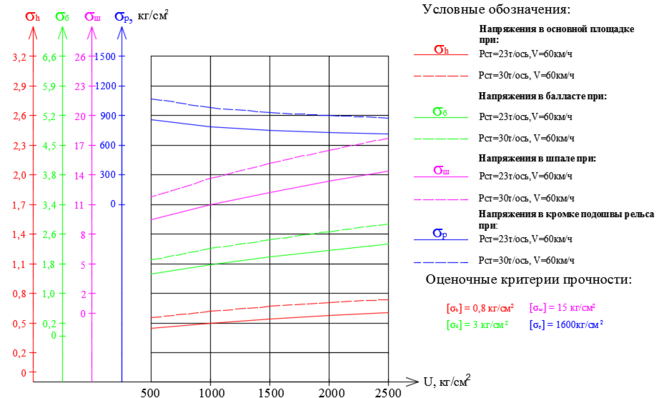 Напряжения на балласте под шпалой и в уровне основной площадки также изменяются по линейному закону, наибольшие значения 2,67 кг/см2, что ниже допускаемого значения 3 кг/см2. Для снижения уровня величин напряжений рекомендуется укреплять основную площадку земляного полотна прослойками из мелкозернистого песка, сортированного гравия.