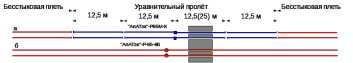 Рисунок 4.2 – Схема расположения уравнительного пролета на переезде: со сборными изолирующими стыками (а); с высокопрочными изолирующими стыками (б).