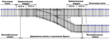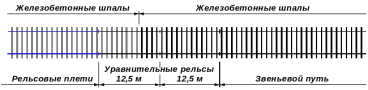 В случае примыкания бесстыкового пути к звеньевому или к стрелочным переводам, на примыкании должны быть уложены две пары уравнительных рельсов длиной 12,5м.