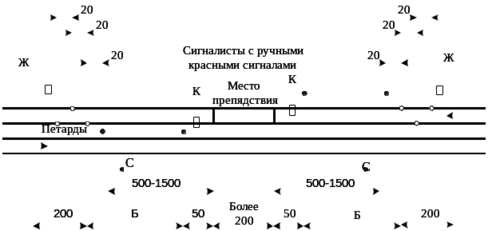 Места производства работ, требующие остановки поездов, при фронте работ более 200 м, ограждаем сигналами остановки порядком, указанным на рисунке 3.3.