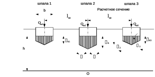 Нормальное напряжение в балластом слое и на основной площадке земляного полотна определяются на глубине h от подошвы шпалы в сечении пути под расчетным колесом. Расчетное колесо располагается по направлению оси шпалы.