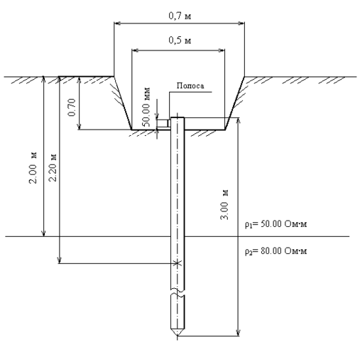 Монтажные параметры одиночного заземлителя в двухслойном грунте указаны на рисунке 5.2, а конструкция заземляющего устройства на рисунке 5.3