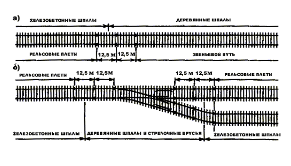 Рисунок - 4.1. Схемы примыкания бесстыкового пути на железобетонных шпалах к звеньевому пути (а) и к стрелочному переводу (б)
