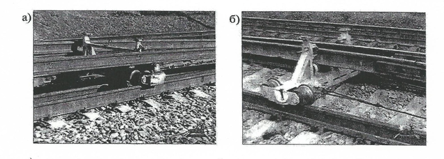 Рисунок 4.4 – Тележки для надвижки рельсовых плетей: a) тележка для перемещения рельсовых плетей из середины колеи на подрельсовые площадки. б) тележка для перемещения инвентарных рельсов с посадочных мест внутрь колеи.