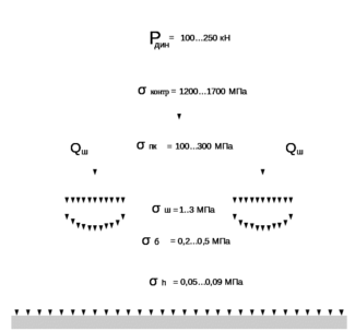 Р-вертикальная сила; σпк - в кромках подошвы рельса; σш – в шпале (в прокладке) под подкладкой; σб – в балласте под шпалой; σh – на основной площадке земляного полотна.