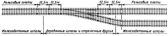В случае примыкания бесстыкового пути к звеньевому или к стрелочным переводам, не ввариваемым в плети, на примыкании должны быть уложены 2 пары уравнительных рельсов длиной по 12,5 м.