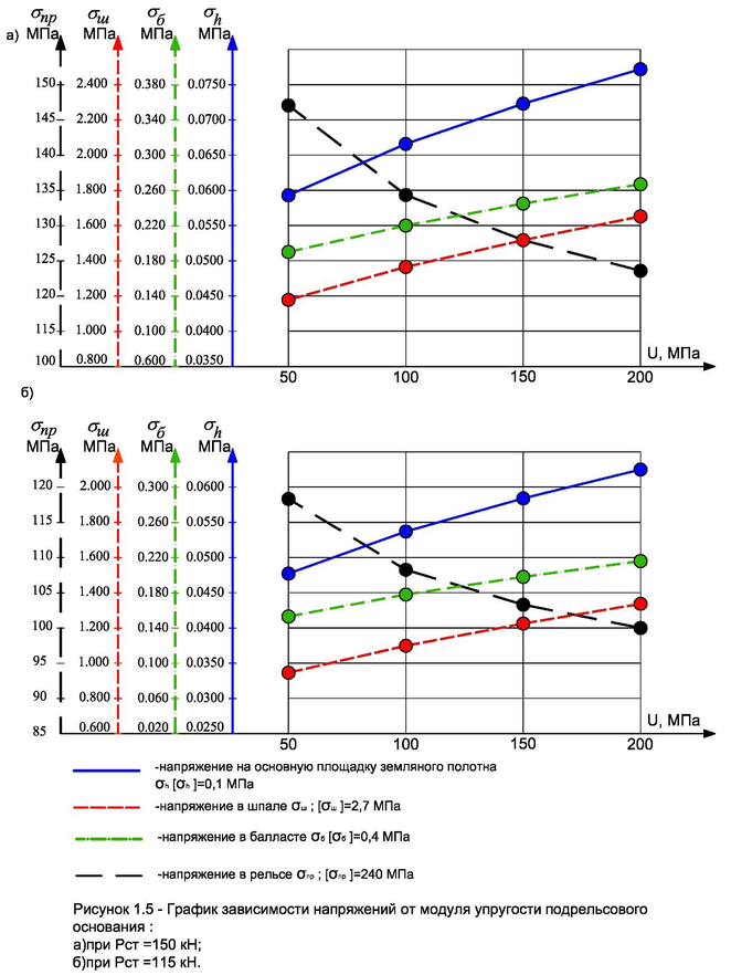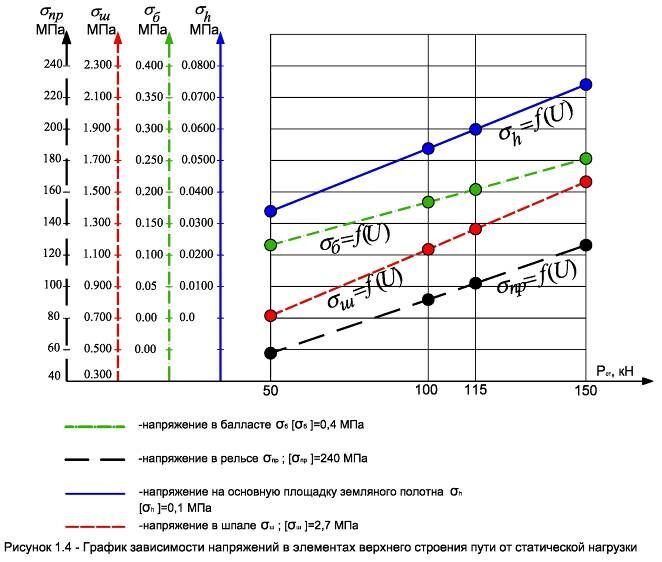 Вывод: В пункте 1.2.2.3 были произведены расчеты пути на прочность и выполнено сравнение полученных результатов с допускаемыми оценочными критериями прочности. Определили, что полученные результаты не превышают максимально допустимых норм. Следует, что конструкция пути соответствует всем нормам прочности пути и не требует изменений.