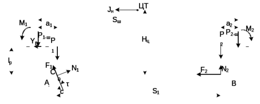 На расчетной схеме вертикальная нагрузка от кузова на колесную пару представлена силами Р1-ш и Р2-ш, которые в статике принимаются равными.