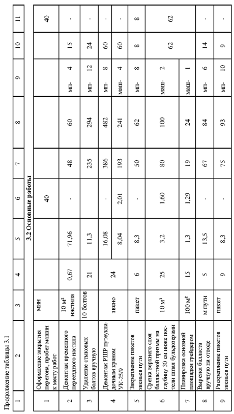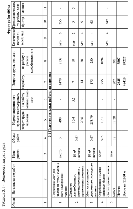 Объемы работ рассчитываем в соответствии с протяженностью фронта работ в “окно”. Затраты труда подсчитываем для каждой отдельной работы в соответствии с техническими нормами на подготовительные работы; основные работы в “окно” и отделочные работы.