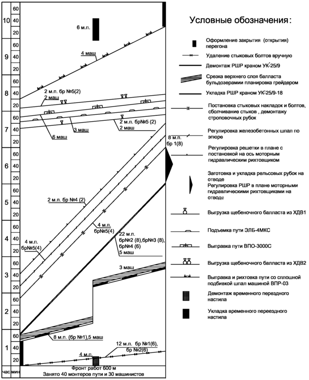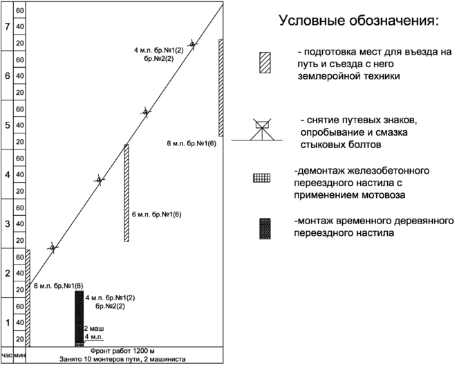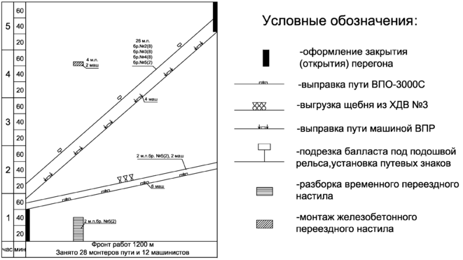 При проектировании основных работ в “окно” составляется график производства работ, который позволяет определить последовательность, время начала, продолжительность и время завершения всех операций при выполнении ремонта, положение путевых машин в любой момент времени. При разработке графика технологического процесса необходимо обеспечить максимальную выработку в час «окна» при принятом комплекте путевых машин.
