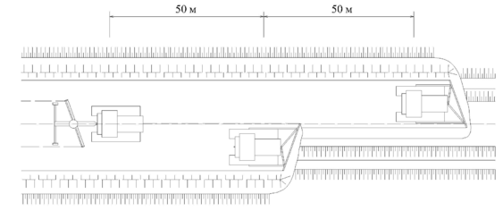 Схема расстановки бульдозеров и грейдера при срезке старого балласта представлена на рисунке 3.8.
