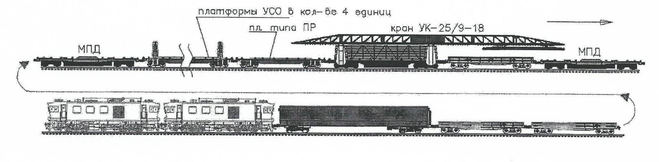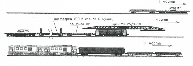 На месте работ путеукладочный поезд расцепляется на три части: в первой части – моторная платформа МПД и четырехосная платформа, во второй части – путеукладочный кран УК 25/9 – 18, комплект четырехосных платформ оборудованными роликовыми транспортерами и устройствами УСО, в третьей части – сцеп из двух порожних платформ, вагона сопровождения и локомотива в хвосте поезда (рисунок 4.8).