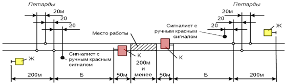 Схема ограждения места работ, требующих остановки подвижного состава, фронтом менее 200 метров показана на рисунке 5.1.