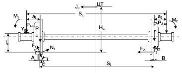 Р1-р и Р2-р – нагрузка от колес на рельсы; Р1-ш и Р2-ш – нагрузка от кузова на шейки оси колесной пары; М1 и М2 – моменты, действующие на шейки оси; а1 и а2 – расчетные консоли шейки оси;Yр – рамная сила; lр – расстояние от головки рельса до приложения рамной силы; Iн – центробежная сила; Нц – расстояние от головки рельса до приложения центробежной силы; N1 и N2 - реакции рельсов;