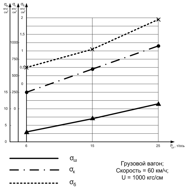 На рисунке 1.2 приведены графики зависимостей напряжений в элементах ВСП от статической нагрузки на колесо. Для расчетов использовались три значения Рст: 6, 15 и 25 тонн на ось. При увеличении статической нагрузки происходит увеличение всех напряжений в элементах ВСП.