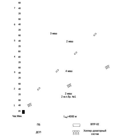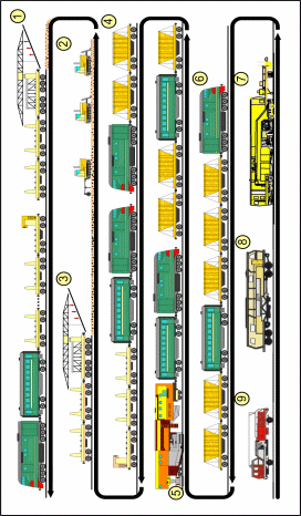 Рисунок 3.4 – Технологическая цепочка путевых машин: 1 - путеразборочный состав; 2 - срезка и планировка балластной призмы; 3 - путеукладочный состав; 4, 6 - хоппер-дозаторные составы; 5 - поезд с машиной ВПО-3000; 7 - машина ВПР-02; 8 - машина ДСП; 9 - машина ПБ