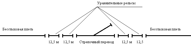 Если рельсовую плеть необходимо соединить со стрелочным переводом, то это соединение осуществляется посредством двух пар уравнительных рельс (рис. 4.1).