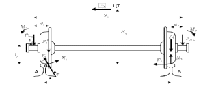 Р1-ш и Р2-ш – нагрузка от кузова на шейки оси колесной пары; Р1-р – полная динамическая вертикальная нагрузка передаваемая от левого колеса на рельс A в точке O; Р2-р- правая динамическая вертикальная нагрузка, передаваемая от правого колеса на рельс B по кругу катания колеса; М1 и М2 – моменты, действующие на шейки оси; а1и а2 – расчетные консоли шеек оси; Yр – рамная сила; lр – расстояние от головки рельса до приложенной рамной силы; Jн – центробежная сила; Нц – расстояние от головки рельса до места приложения центробежной силы; F1 и F2 – силы трения гребня и поверхности катания колес по рельсам; N1 и N2 – реакции рельсов; S1 – расстояние между точками контакта колес с рельсами; Sш - расстояние между точками приложения сил к шейкам оси.