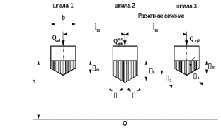 Нормальное напряжение вбалластом слое и на основной площадке земляного полотна определяются на глубине h от подошвы шпалы в сечении пути под расчетным колесом. Расчетное колесо располагается по направлению оси шпалы.